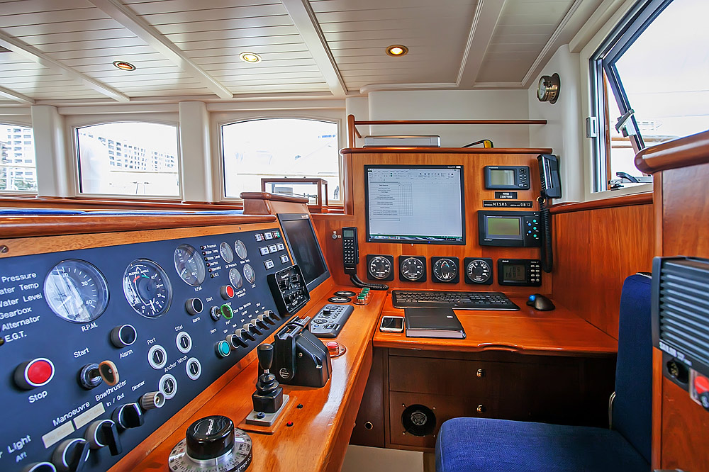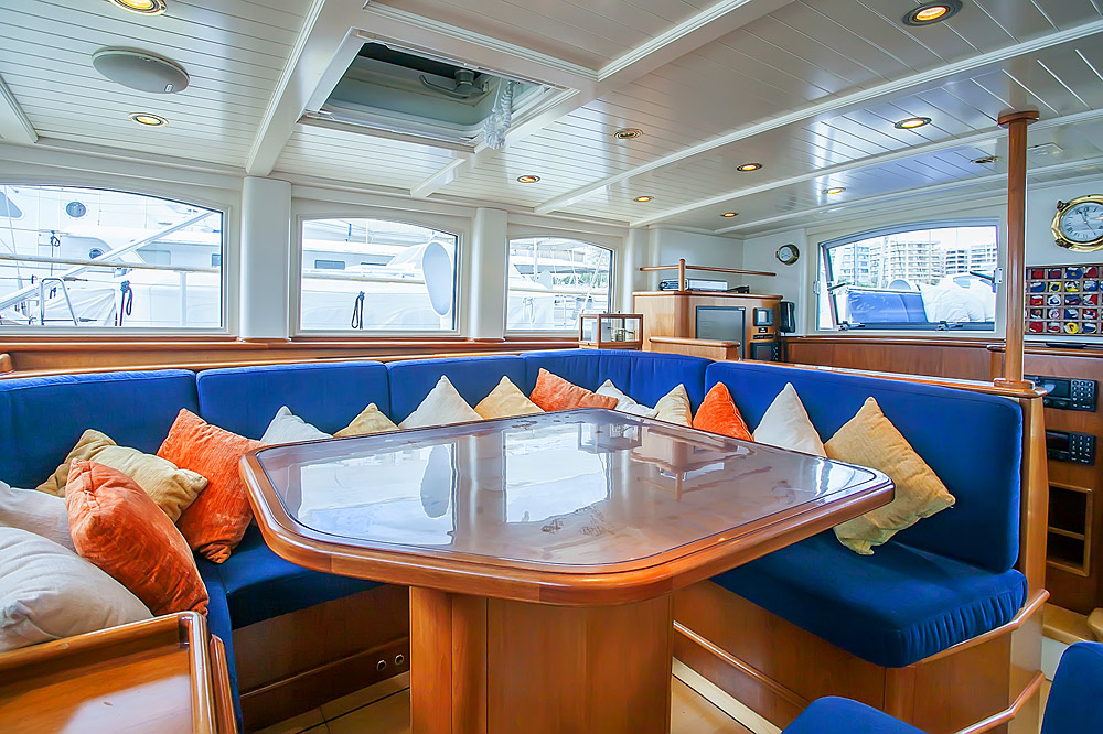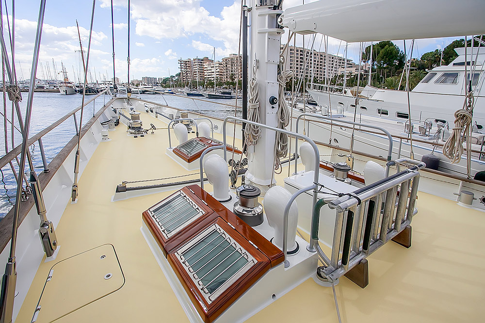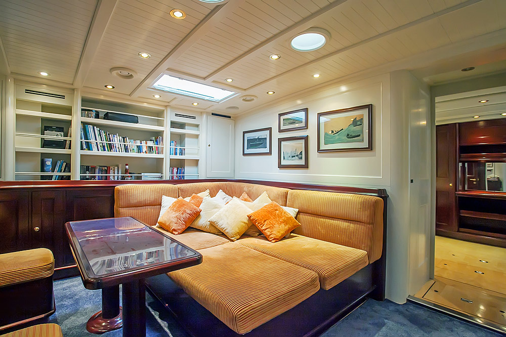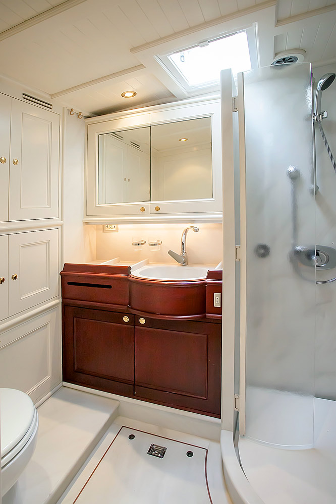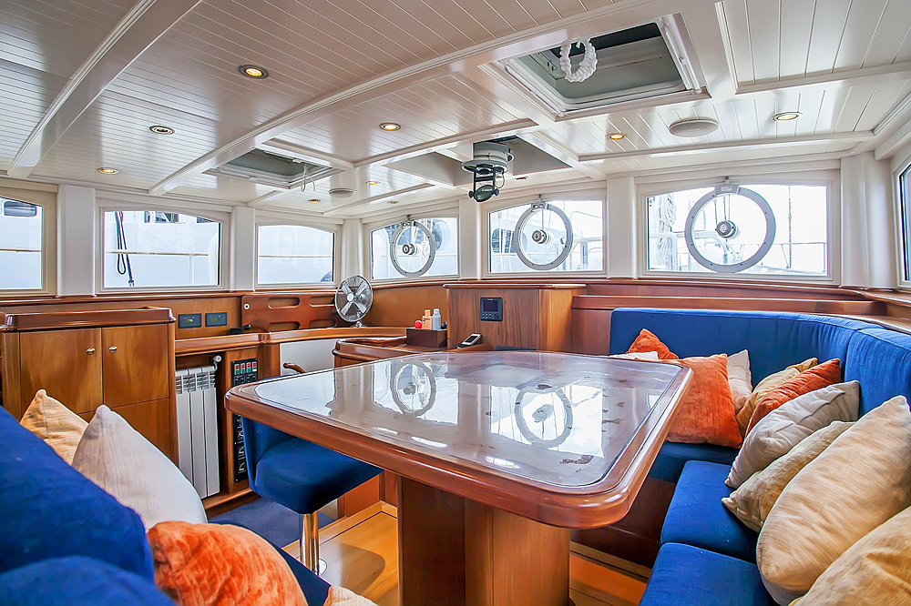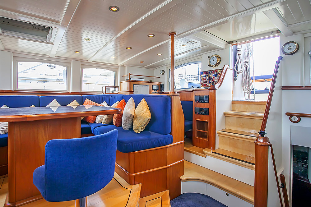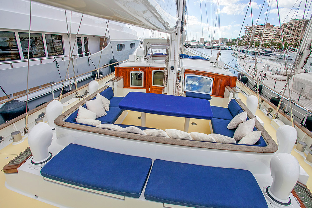 The brief from the owner of Reesle was for a no-nonsense expedition schooner, a super strong and super safe design that would be more of a ship than a yacht. She therefore has a reinforced hull, six watertight bulkheads, a full-length bulwark and an oversized equipment package that includes twin engines, twin gensets and double variable pitch propellers. Her schooner rig with in-mast furling is exceptionally sturdy; hydraulic captive winches and a relatively high freeboard add to the explorer feel. Reesle has two cockpits; one forward, that’s ideal for socializing and one aft which contains a large wheelhouse and an extensive array of navcom equipment.