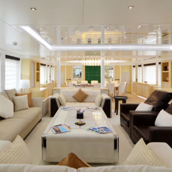 Super Yacht JADE's interior is created by Yacht Design Central Yacht, they designed a contemporary interior in muted neutrals. Italian cachet is added with fusion house Fendi; meaning custom-made sofas and chairs with so leather furnishings. JADE accommodates up to 12 guests in 6 cabins of which 2 master staterooms with an extra optional sofa bed each. Her enormous interior space includes a spacious (business) lounge adjoining the VIP master room, separate dining and breakfast/ play rooms and a yoga/ massage room. Children and adults alike will enjoy the Jacuzzi and the comfy-cushioned loft with play stations and superb panoramic view. There is a state-of-the-art entertainment system including MBL radial speakers. For active guests there are plenty of water toys and water sport activities available, including scuba diving. JADE is one of the few charter yachts of her caliber available in South East Asia.