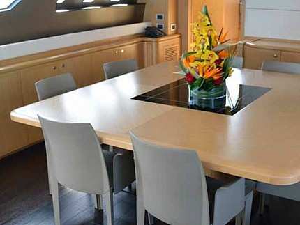 The Ferretti 881 RPH MAXI BEER combines the structural excellence of the original yacht Ferretti 881 with the addition of an upper deck containing a pilot house that dominates the sea. Coming onboard, the spaciousness of the interior together with the use of light tones, make the salon stand out in terms of size and luminosity. Situated on the lower deck, the master cabin has two large open windows on either side that make it an extremely spacious and luminous suite, providing the guests a panoramic view of the sea. In addition to the master suite, there are two twin bied cabins with en-suite bathrooms and a VIP cabin in the bow. M/Y MAXI BEER offers plenty of opportunities to enjoy the sun in total comfort. A spacious fly bridge accommodates a teak table with chairs and Jacuzzi, while the cockpit area offers a comfortable seat for up to six guests.