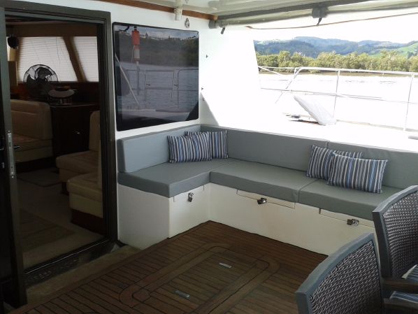 For relaxing, sailing, cruising and so on, the flybridge offers the perfect spot. The view is amazing! Pleasant detail is that you can easily move around the yacht. The decks are covered with anti-slip, so you can safely walk towards the front of the yacht to lounge in the nets rigged between the two hulls.